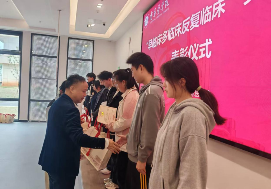 为推动“早临床、多临床、反复临床”实践育人理念深入落实,发挥先进典型的示范作用,激励更多学生积极参与临床实践,2025年11月11日,临床医学院隆重举行“早临床、多临床、反复临床”实践活动表彰仪式。学院副院长朱鹏云、综合办负责人樊亚崑、团学办副主任陈熠敏出席,并为获奖学生代表颁奖。