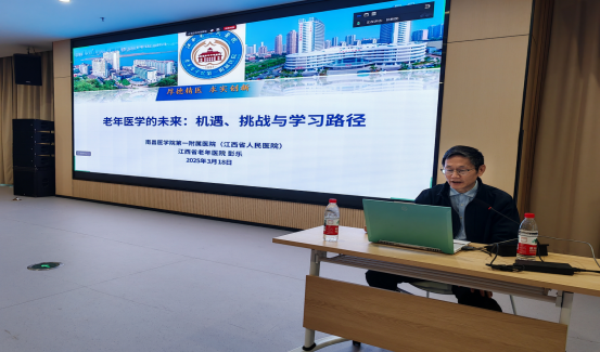 讲座中,彭乐主任介绍了国内外及江西老年医学发展成果,我国已建成大量老年医学科和老年友善医疗机构,江西也通过成立医学会、组建联盟、开展人才培训等稳步推进区域学科发展,同时和学生交流沟通,让学生深入参与、互动。他还展望,老年医学未来将向精准化、智能化、整合化发展,人工智能、远程医疗等技术将为学科发展赋能。