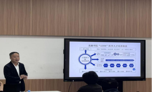 临床医学院副院长朱鹏云就龙湖书院“12356” 特色育人体系作详细介绍。龙湖书院立足 “健康中国” 战略,以立德树人为核心,构建 “一核引领、双驱联动、三阶递进、五能赋能、六维提质” 的系统化育人框架,传承弘扬红医精神,分阶段推进价值塑造、能力培养与知识传授有机融合,重点培育学生学习力、创新力、思维力、实践力、人际交往力五大核心能力,从人文底蕴、社会责任、科学精神、创新实践、学习能力、身心健康六个维度全面提升育人质量,致力培养家国情怀深厚、专业本领过硬的新时代红医传人。
